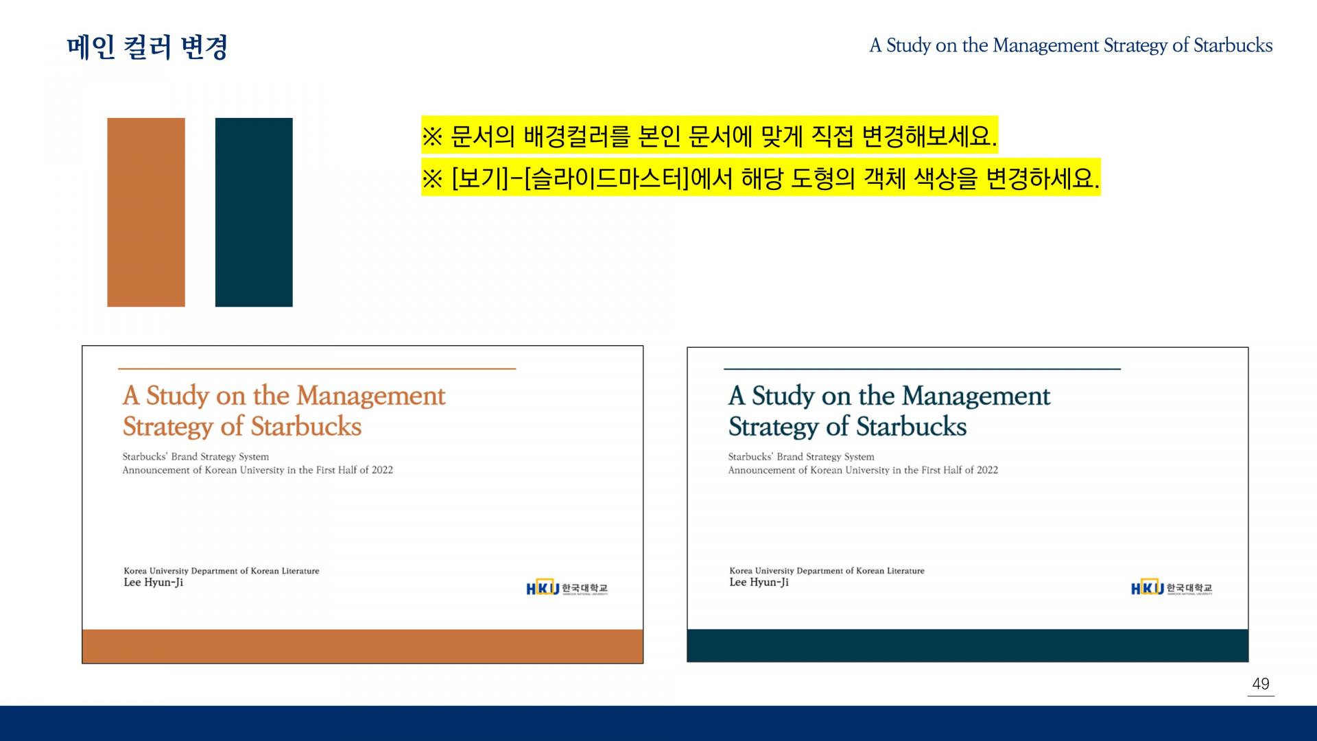 - 문서의 디자인 컬러를 바꿀 수 있습니다. 발표 현장에 맞게 컬러를 바꿔보세요.