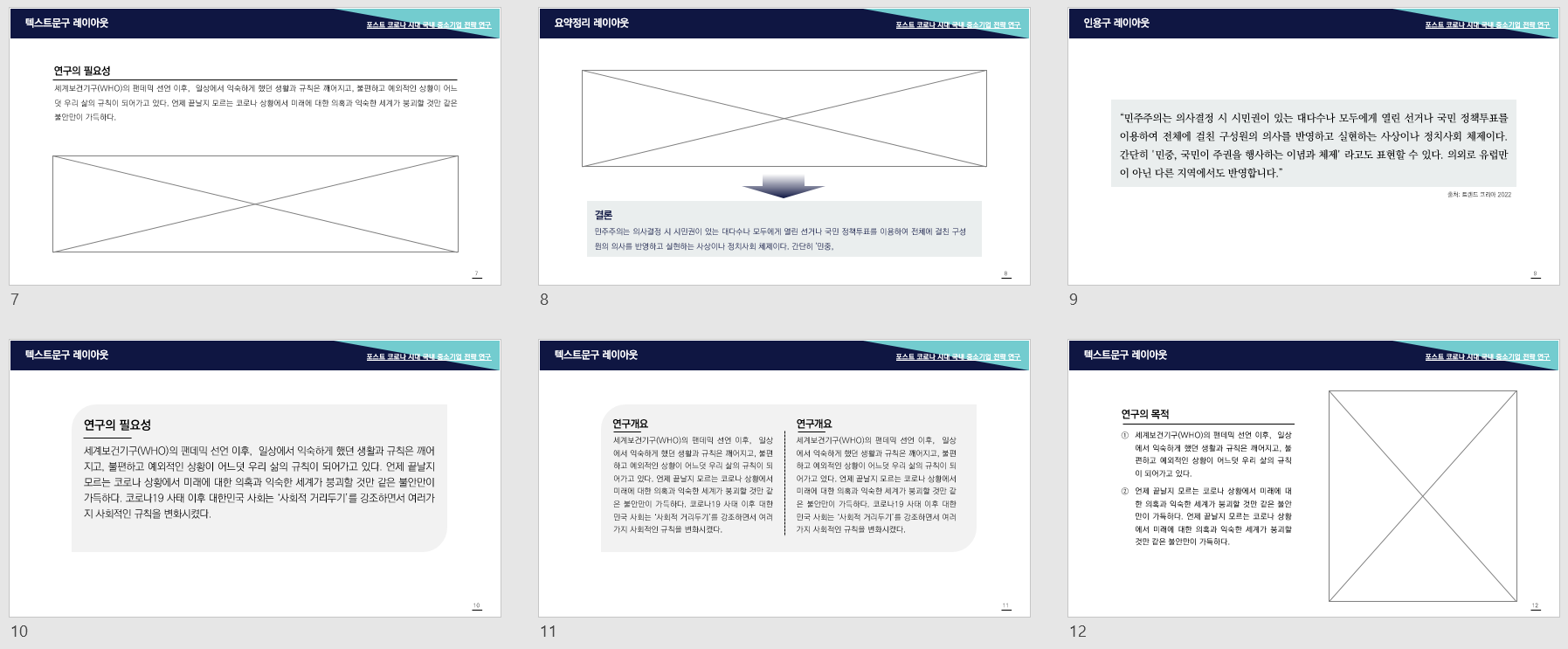 슬라이드에서 텍스트나 도형이 변경 안되는 경우는 [보기] - [슬라이드마스터]에 들어가서 해당 슬라이드에서 변경, 삭제 가능합니다. (공지사항 - 자주하는 질문 참고)
