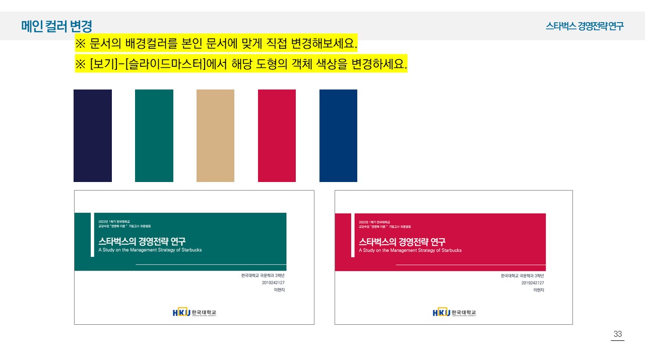 - 문서의 디자인 컬러를 바꿀 수 있습니다. 발표현장에 맞게 컬러를 바꿔보세요.