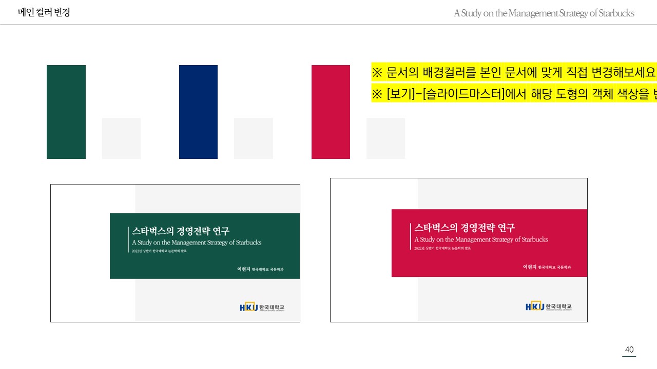 - 문서의 디자인 컬러를 바꿀 수 있습니다. 발표현장에 맞게 컬러를 바꿔보세요.