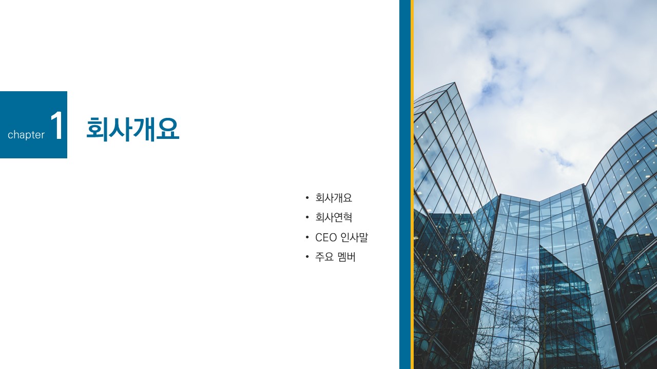 - 회사소개서에 필수적으로 필요한 다양한 콘텐츠를 추가하였습니다.
