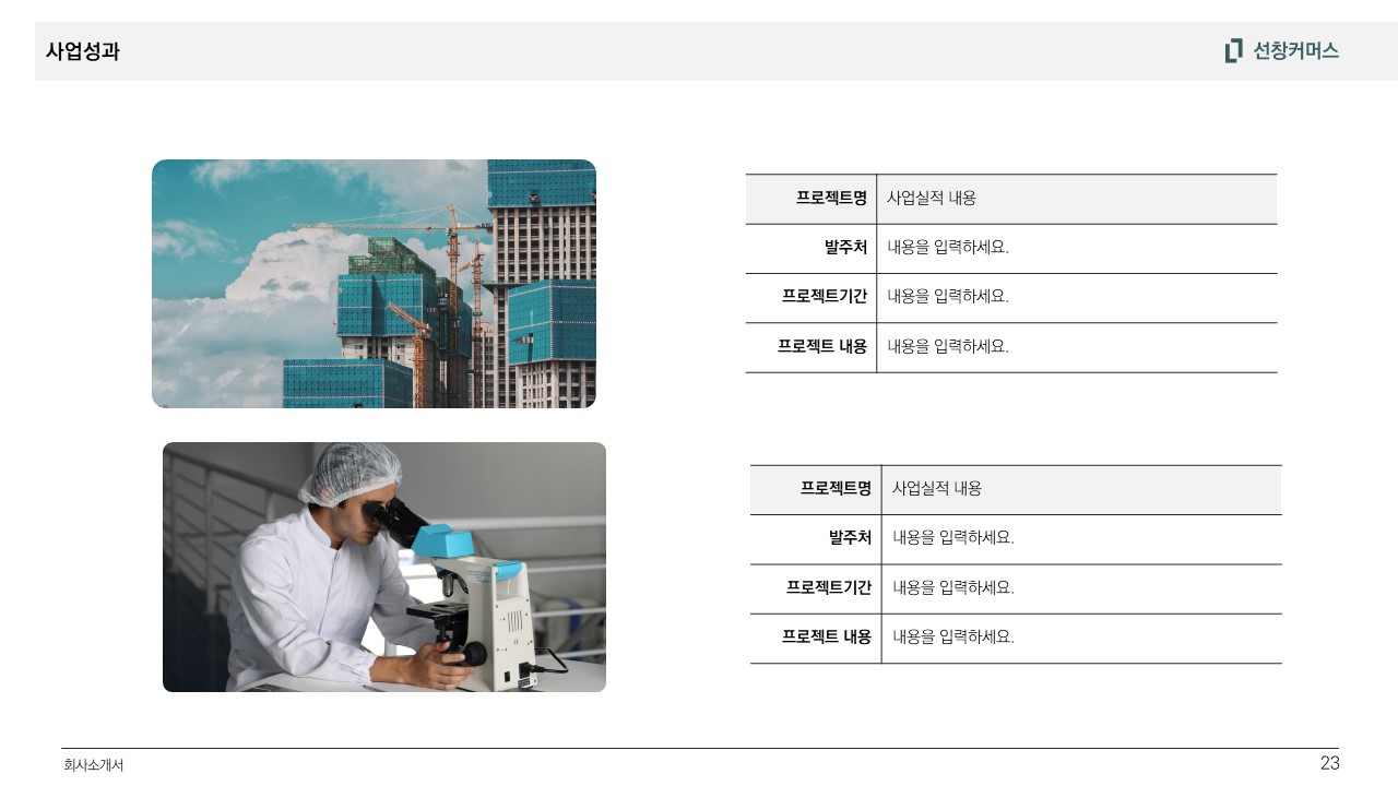 - 회사소개서에 필수적으로 필요한 다양한 콘텐츠를 추가하였습니다.