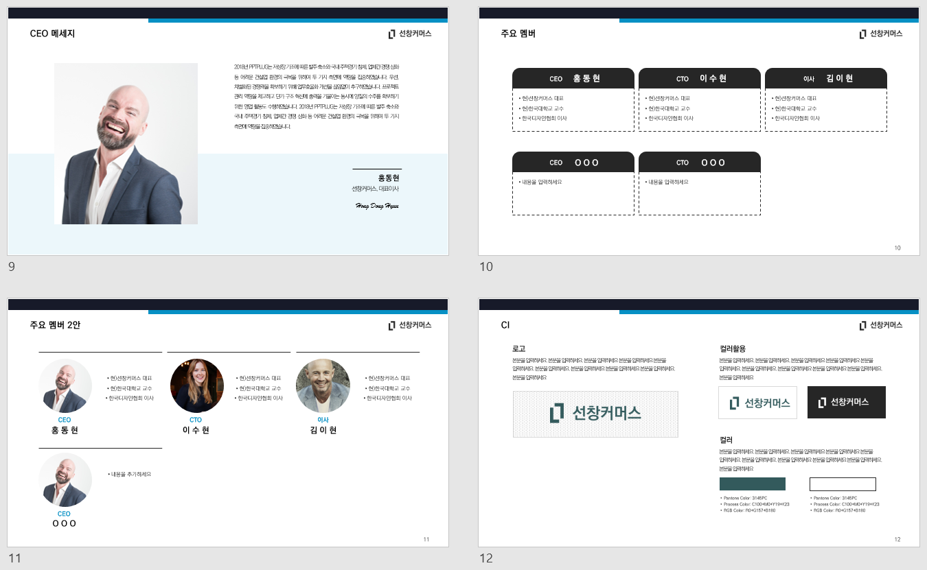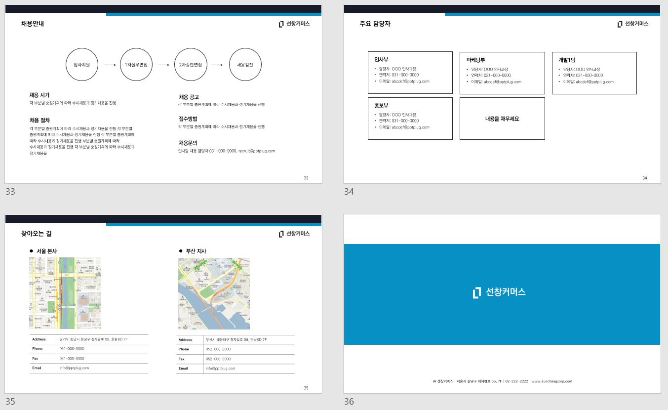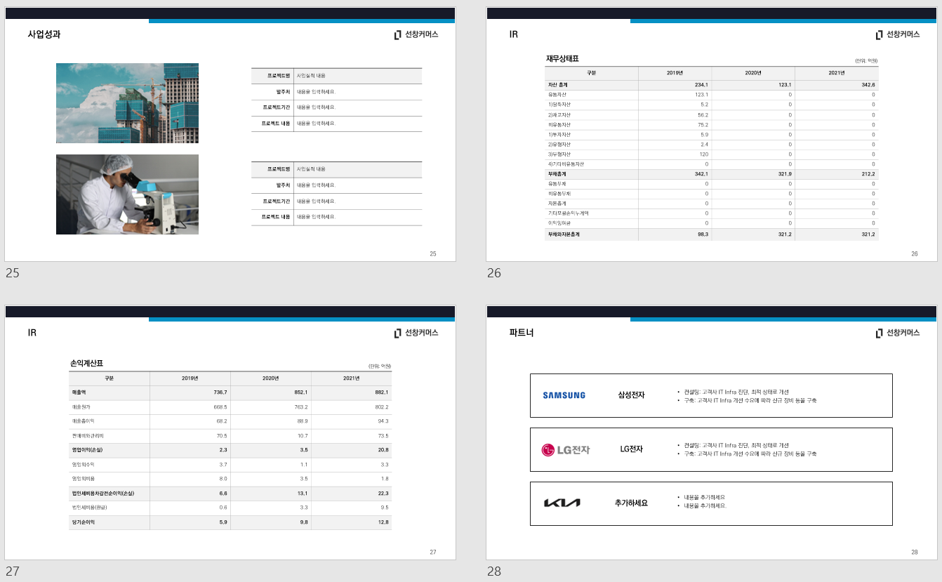 - 회사소개서에 필수적으로 필요한 다양한 콘텐츠를 추가하였습니다.