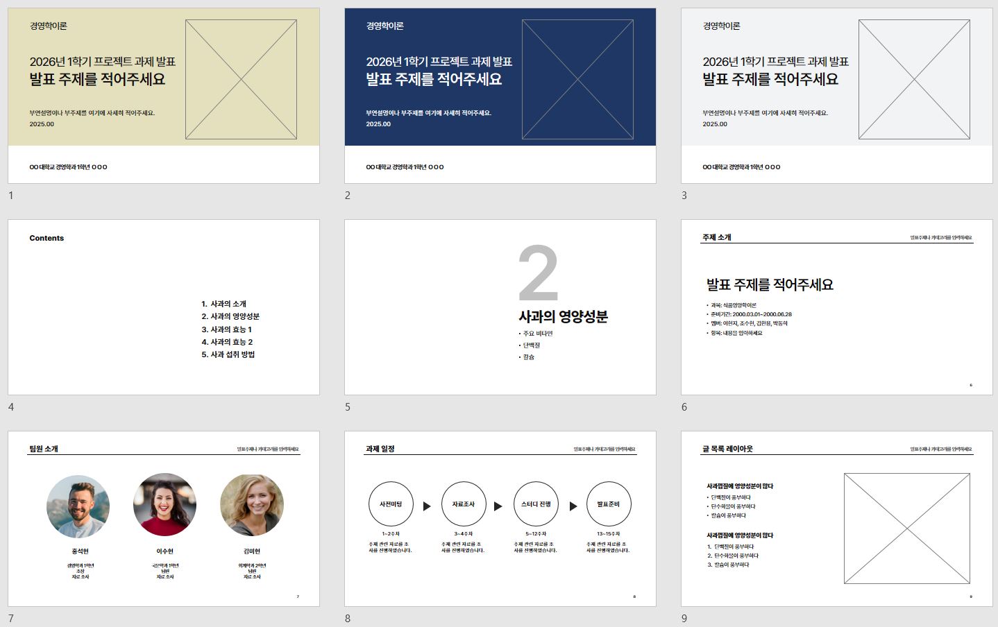 - 대학교 과제 발표용 PPT 템플릿 문서입니다.